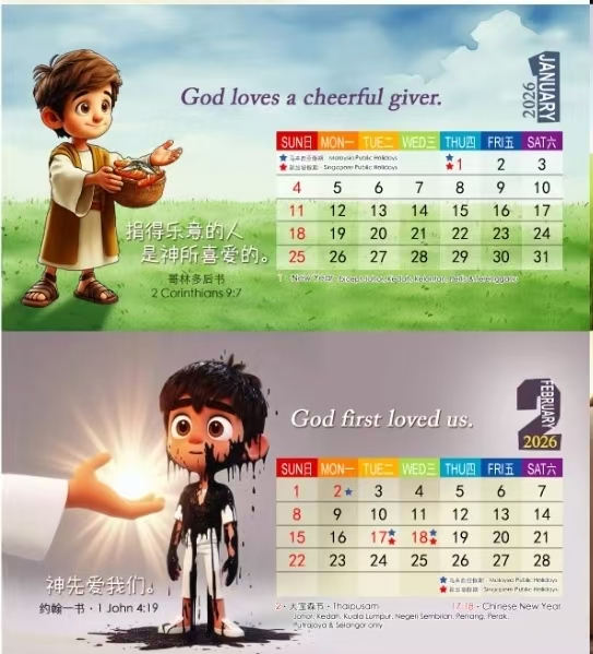 我们也提供设计及印刷教会的资料如名字、地址、聚会时间等在台历前和后页的下端。此服务的费用是RM80。但若数量有100份或以上,我们将免此服务费。